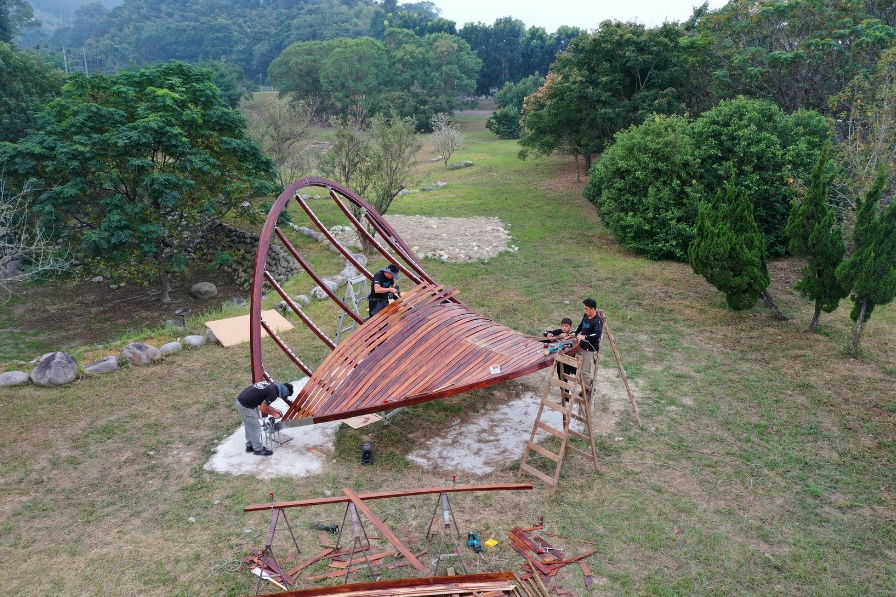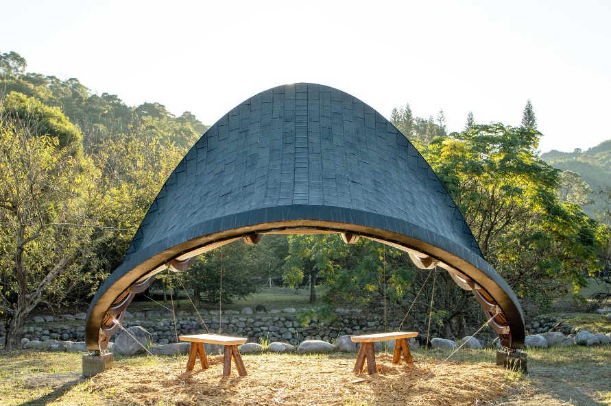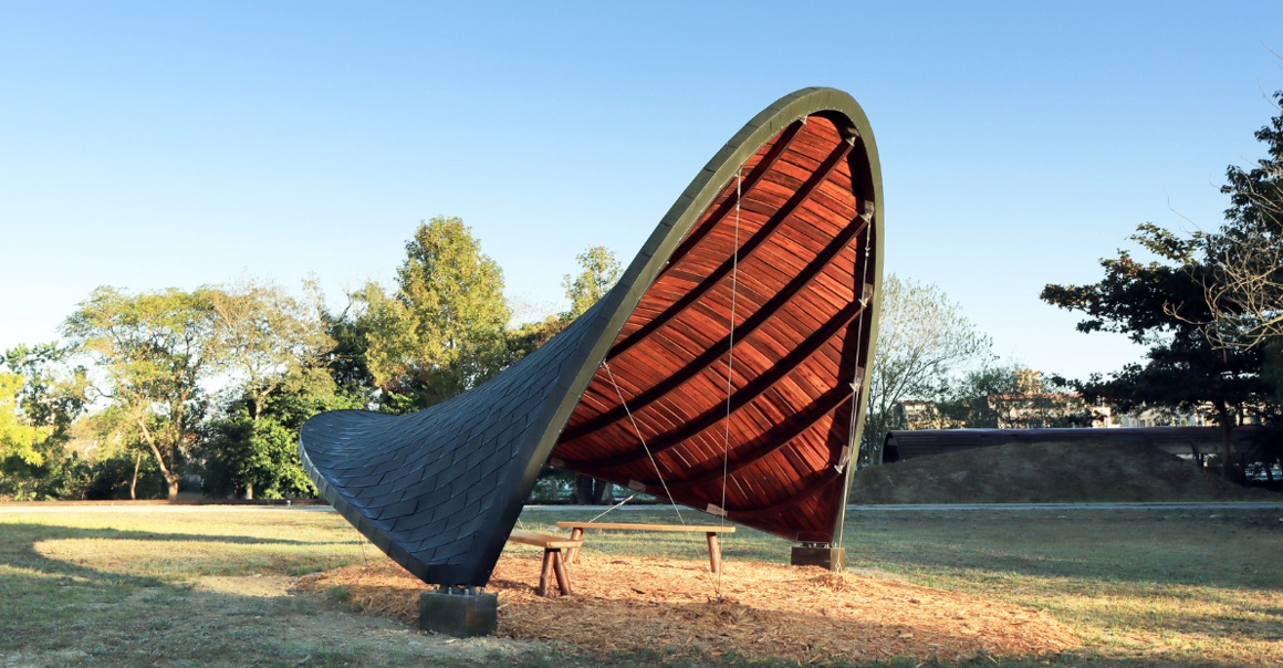 在台中東勢林業文化園區,一座彷彿從山林曲線中誕生的木構建築悄然落成。這座名為「弦閣」的展亭,是由國立陽明交通大學建築研究所與香港大學建築學院跨校合作的成果,以創新的結構設計與國產木材的應用,為永續建築注入全新詮釋。