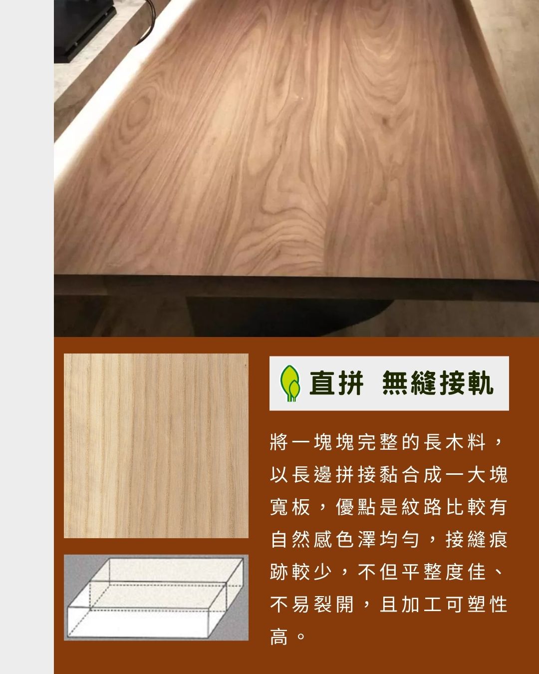 實木拼板,又稱實木指接板或集成板,是將原木小塊料,經裁切、拼接、黏合等二次加工製成整片式木料。由於原木實木不易取得大面積的板材,因此實木拼板就誕生了!! 實木拼板的紋理有「直紋」與「山形紋」,直紋是指徑切,紋理與年輪接近垂直;山形紋是指弦切,紋理與年輪接近平行。