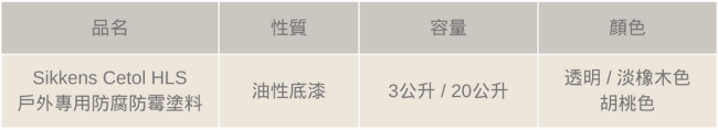 常見用於:圍牆、戶外家具、木構建築,最為底漆及耐磨面漆。