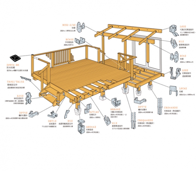 因此在建造時,各部五金諸如桁架吊勾、角鐵、洋釘等連接件,都應經由熱浸鍍鋅處理,以抗腐蝕。而且新一代木材的防腐藥劑,對鐵件的鏽蝕能力更強,必須要用更高標準的連接件,才能確保長久使用。